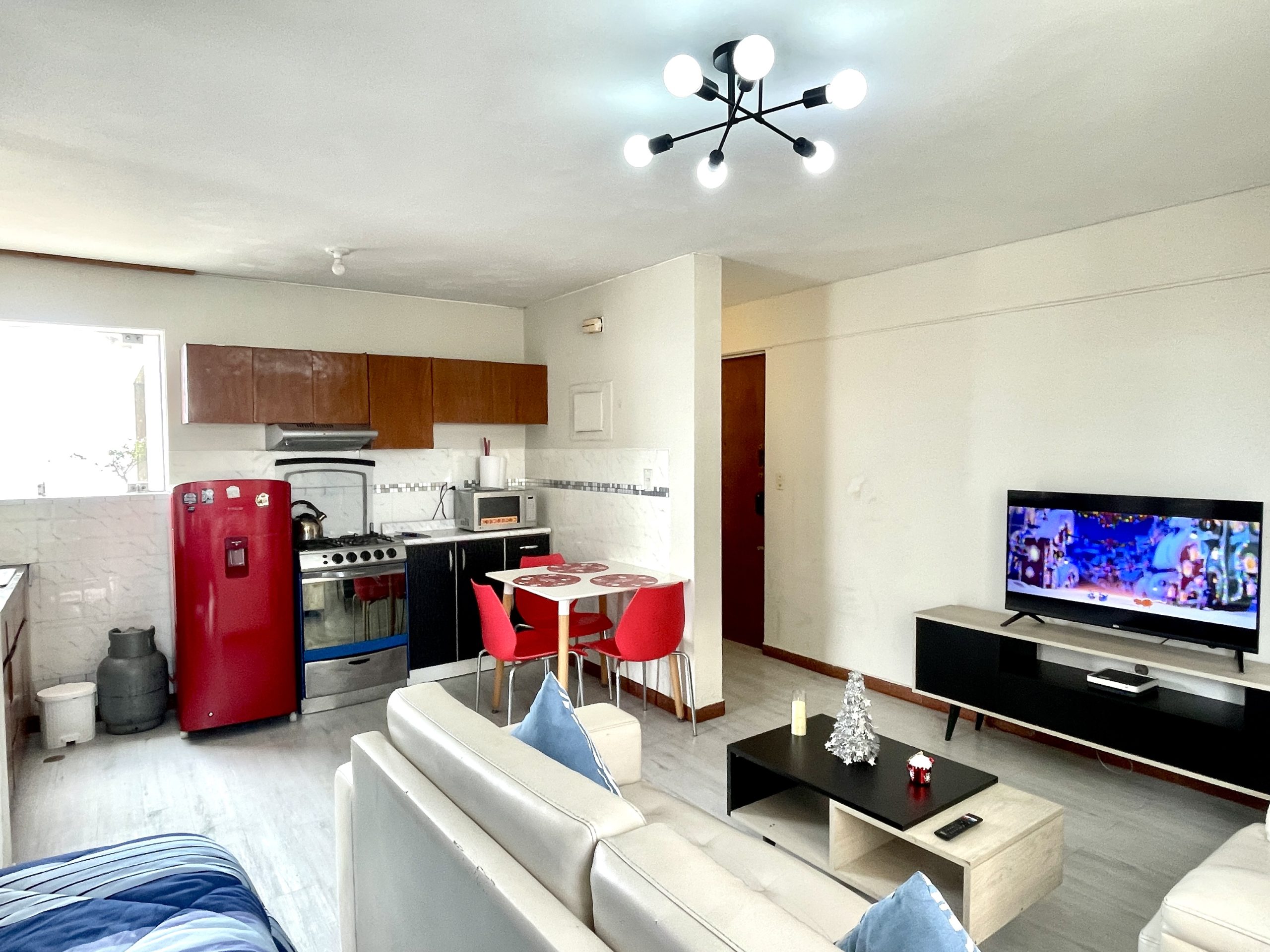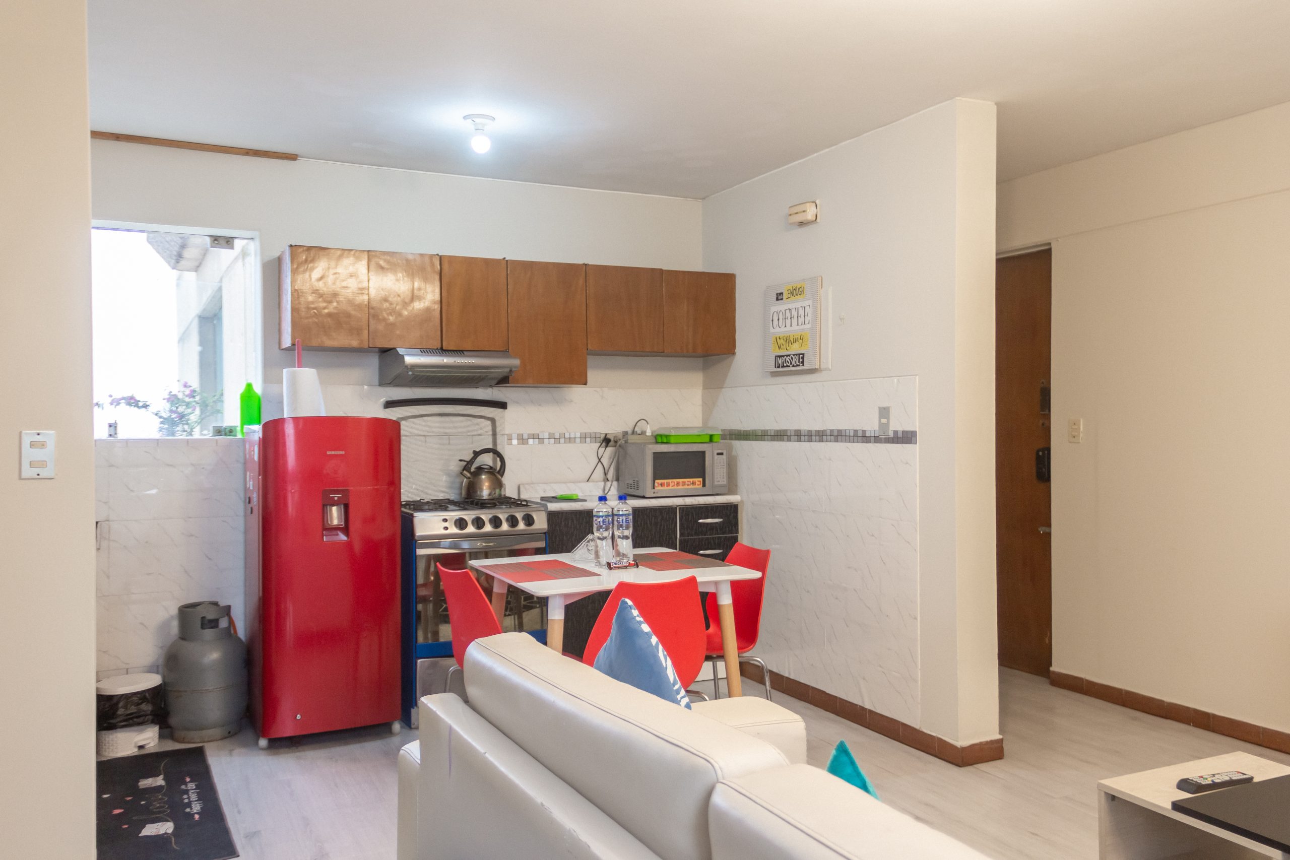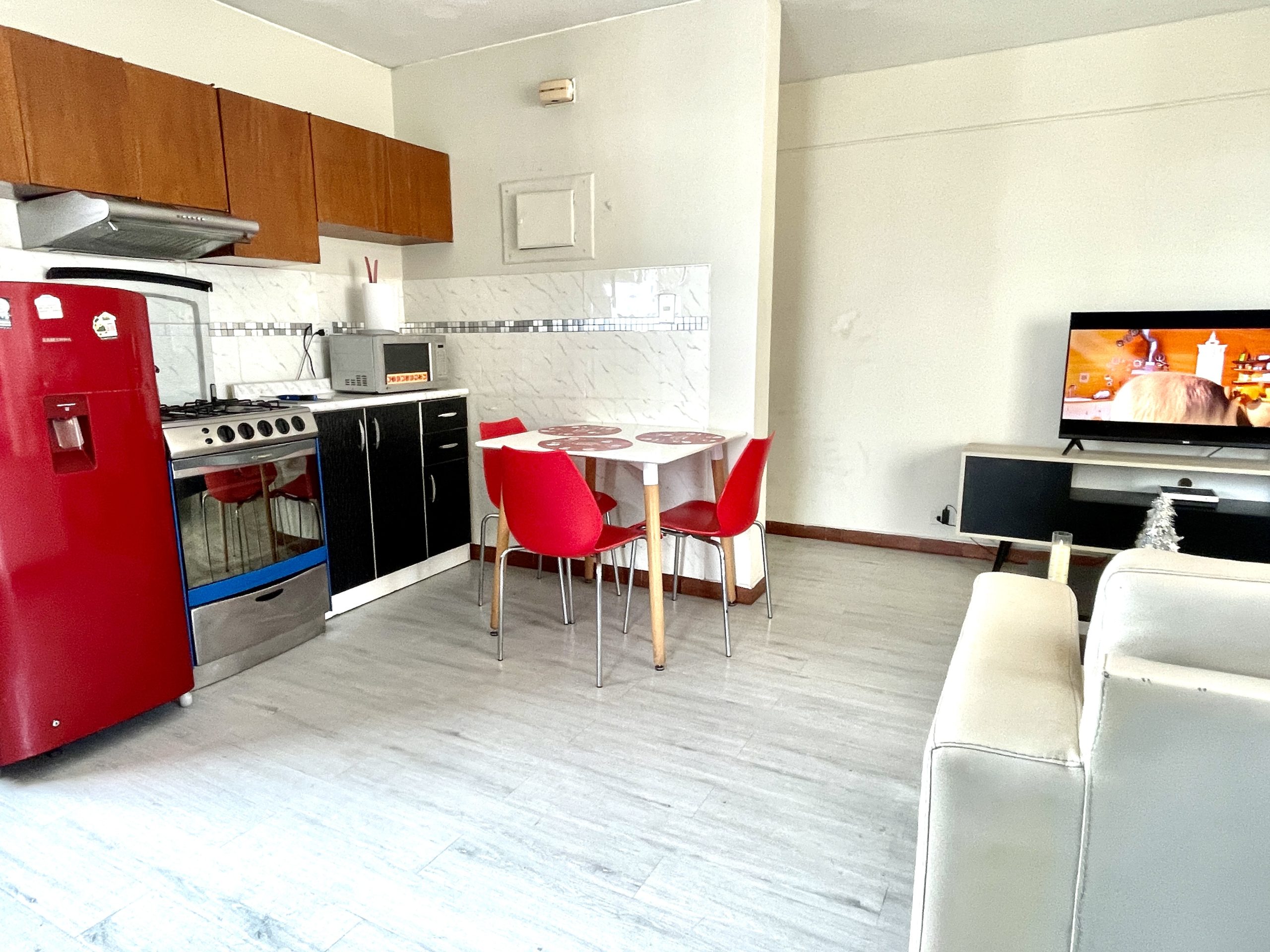 - Cocina: Menaje completo para 3 personas, refrigeradora, cocina, juego de comedor y algunos electrodomésticos para que disfrutes de tus comidas.