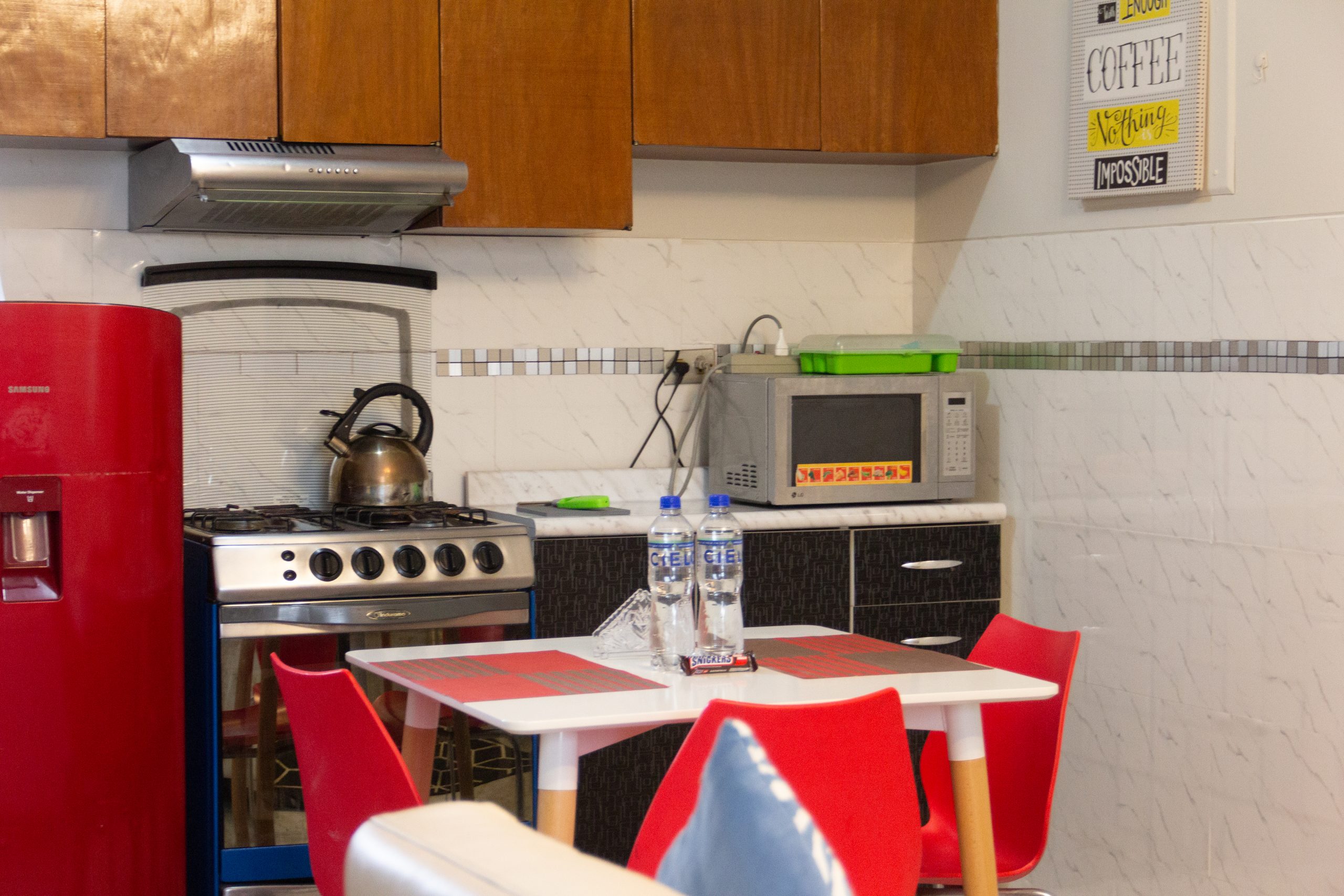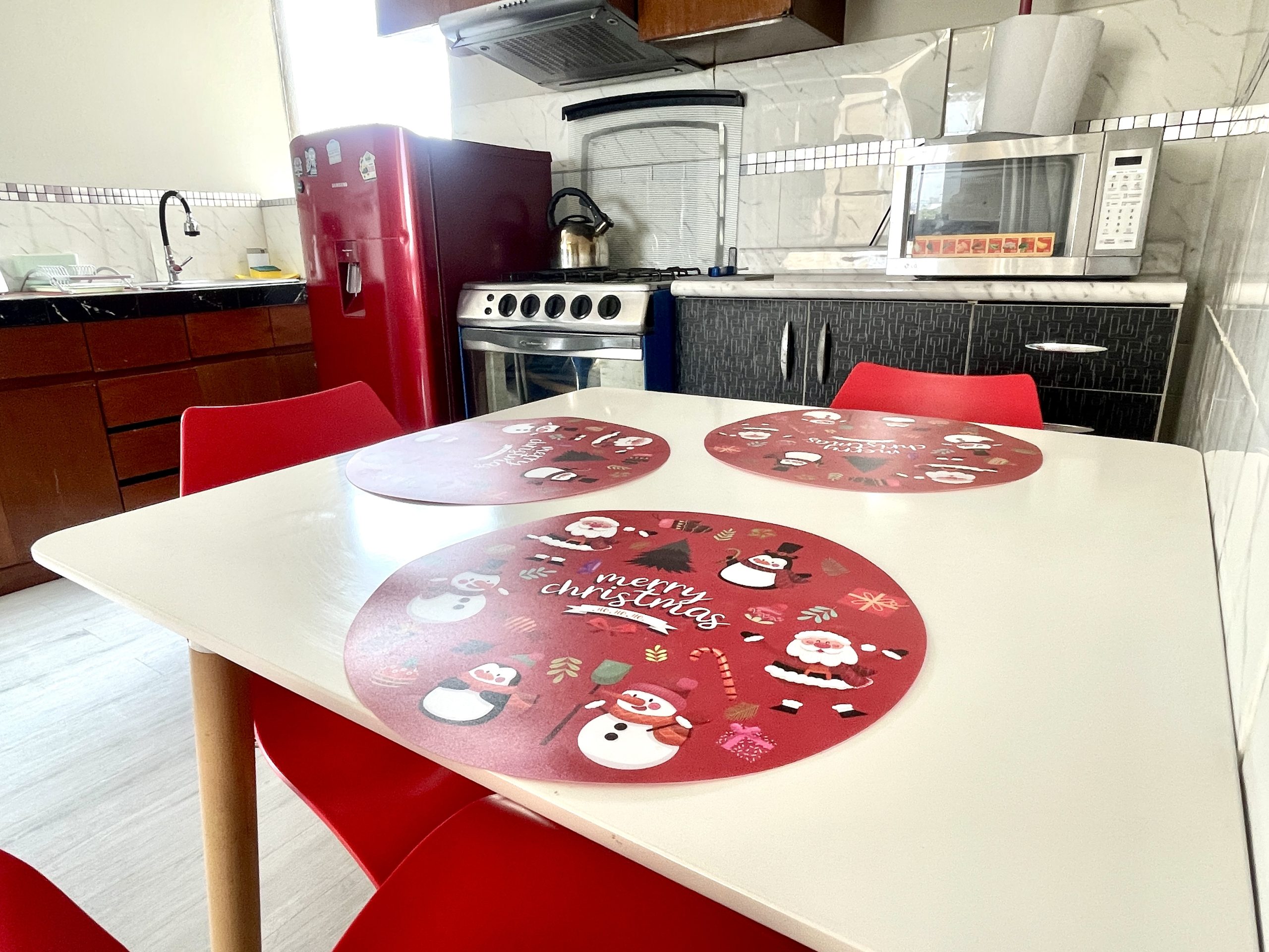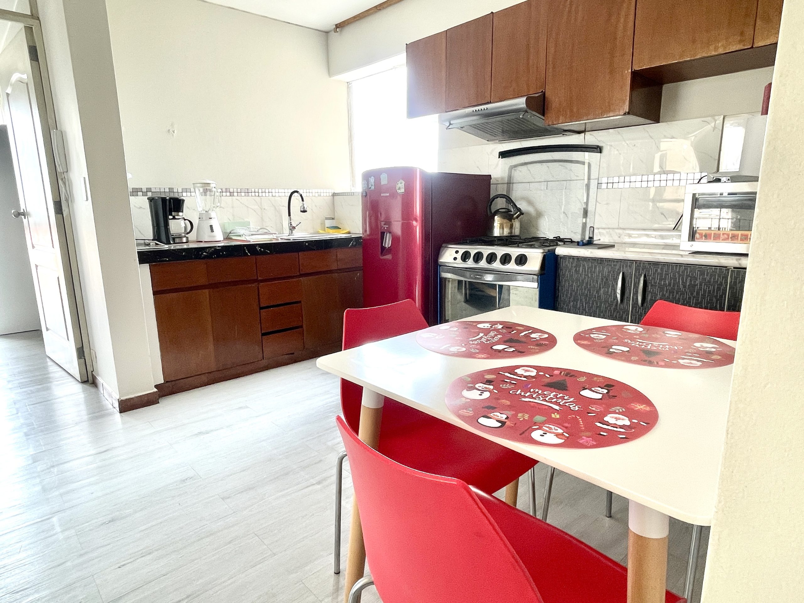 - Cocina: Menaje completo para 3 personas, refrigeradora, cocina, juego de comedor y algunos electrodomésticos para que disfrutes de tus comidas.